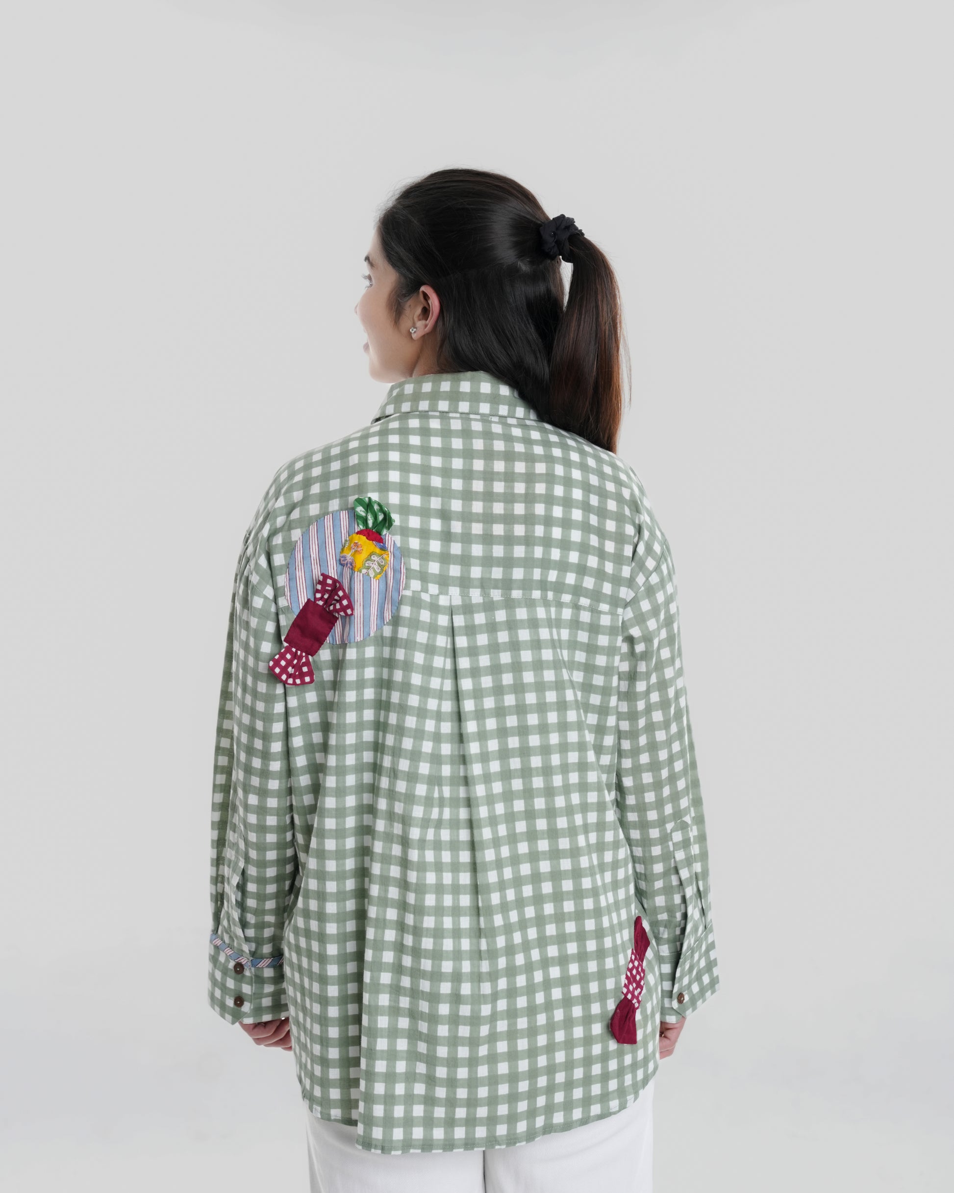 Our ’90s Nostalgia Shirt is a joyful throwback to simpler times, hand-stitched by the women artisans of Purkal using traditional appliqué and embroidery techniques. Made from soft, breathable 100% cotton, it features a green checked base that sets the stage for playful hand-appliquéd motifs, from fruity delights and pocket stationery to the colourful sweets that defined a generation.