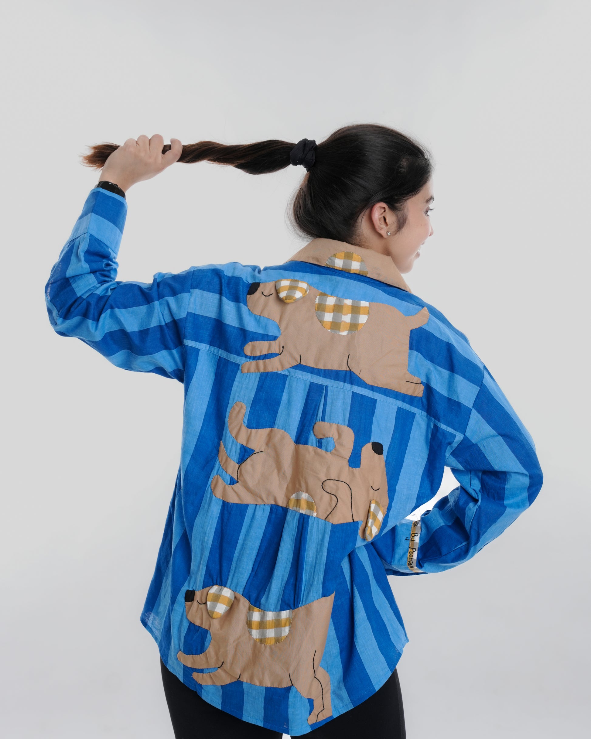 Our Pupster Shirt is a playful celebration of unconditional love and companionship, hand-stitched by the women artisans of Purkal using traditional appliqué and embroidery techniques. Made from soft, breathable 100% cotton, it features a blue bold striped base adorned with hand-appliquéd motifs that capture the many moods of a pup across the back.