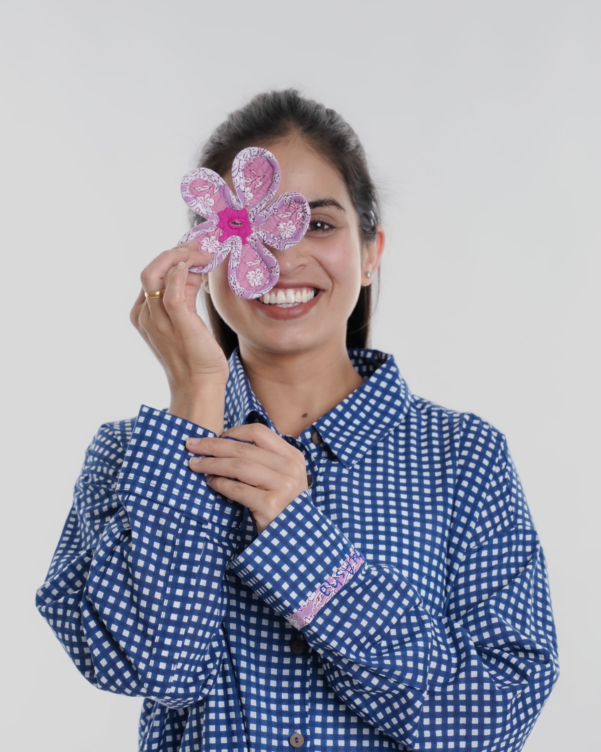 Our Sadabahar Flower Shirt is a gentle ode to nature’s timeless beauty, hand-stitched by the women artisans of Purkal using traditional appliqué and embroidery techniques. Made from soft, breathable 100% cotton, it features a blue checked base brought to life with hand-appliquéd and embroidered Sadabahar florals, each flower sewn with patience and grace.