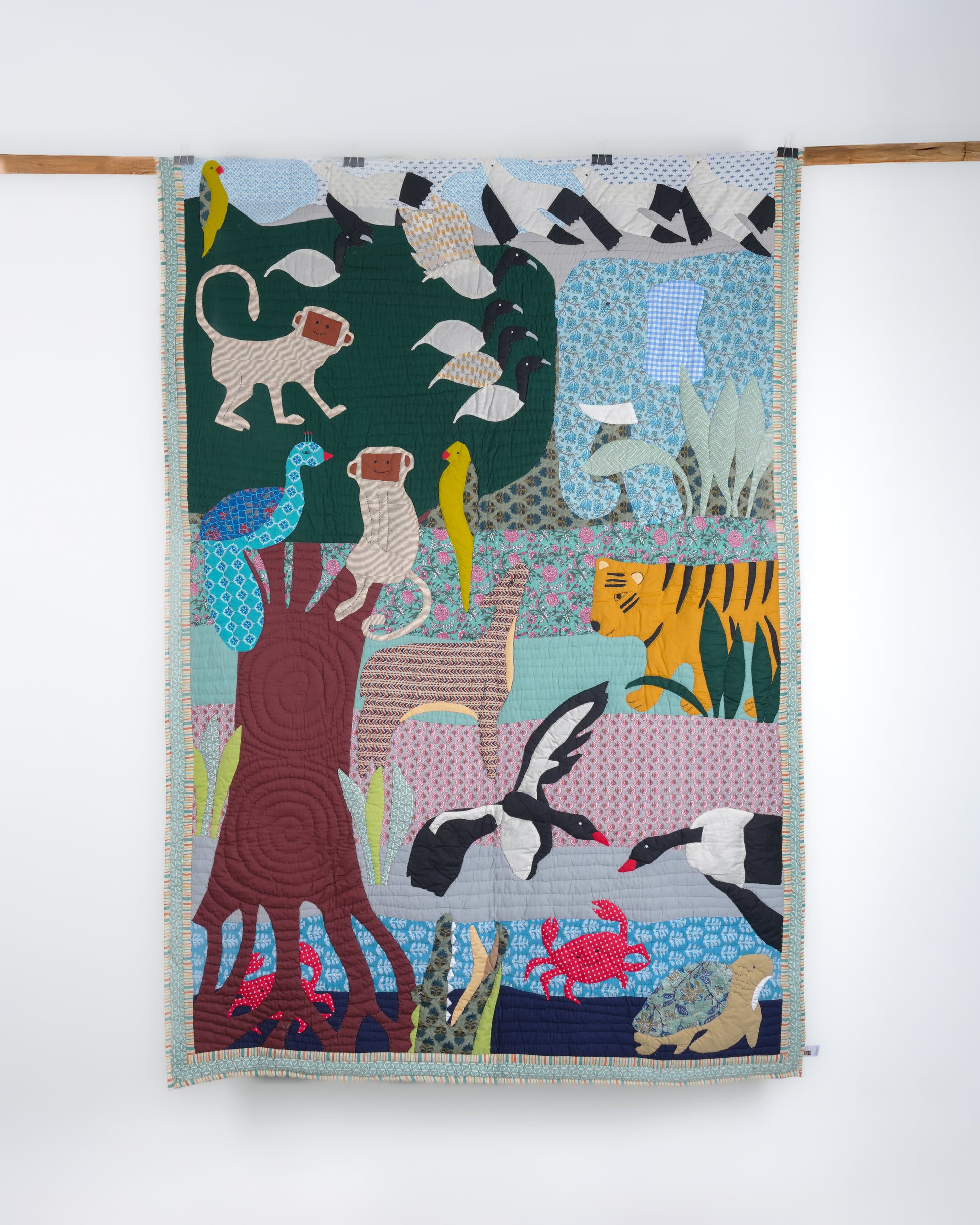 Welcome to Sundarvan, a forest that comes alive one stitch at a time. Inspired by India’s lush jungles, this quilt features playful monkeys, majestic elephants, fierce tigers, and chirping birds in a vibrant celebration of the wild. Handcrafted by the Didis of Purkal Stree Shakti over 170+ hours, it is a joyful blend of comfort, colour, and storytelling.